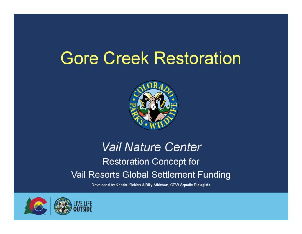 Trout Unlimited, in partnership with the Town of Vail, will conduct stream restoration to restore and enhance instream and riparian habitat in Gore Creek between Ford Amphitheater and the Vail Nature Center. The restoration is aimed at improving water quality and increasing angler access.